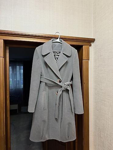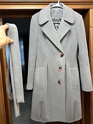 Женское пальто-халат серого цвета - Классический крой с английскими лацканами - Длина миди ниже колена - Запах с поясом из той же ткани для регулировки посадки - Прямой силуэт, длинные рукава - По...