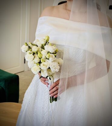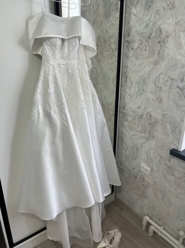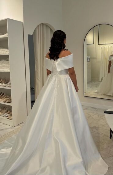 Элегантное женское свадебное платье в пол с атласной отделкой и вышивкой. Платье имеет открытые плечи и шнуровку на спине, что обеспечивает идеальную посадку. Пышная юбка с небольшим шлейфом добавляет образу торжественности. Идеально подходит для свадебной церемонии, создавая изысканный и запоминающийся образ. Платье выполнено в белом цвете, что подчеркивает его классический свадебный стиль, продаю или сдаю напрокат.