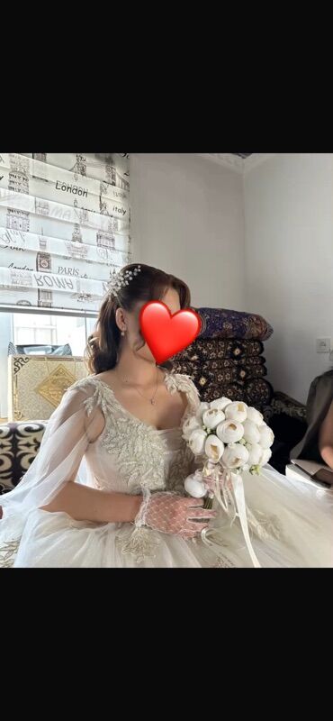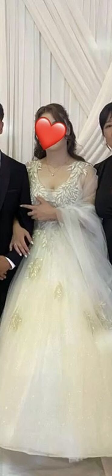 Платье создает легкий, воздушный образ невесты с акцентом на плечи и талию; богатая фактура и сияние ткани красиво смотрятся на фото и при вечернем освещении. Подойдет для классической свадьбы, торжества в зале или фотосессии. Размер ориентировочно S–M (регулируется за счет корсетной посадки).