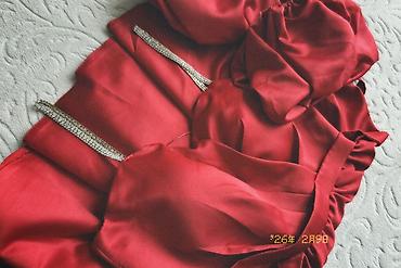 Вечернее красное платье на бретелях с декоративными цепочками-стразами.