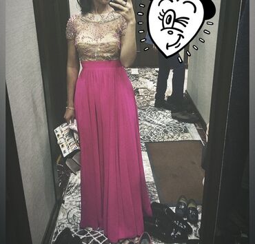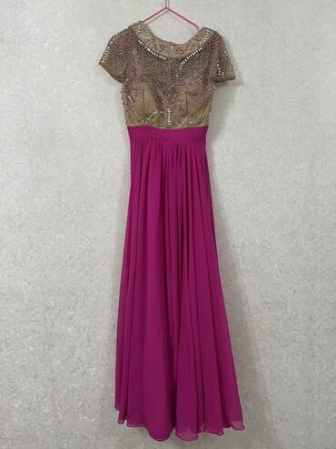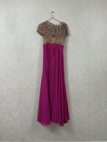 Вечернее длинное платье цвета фуксии с расшитым верхом