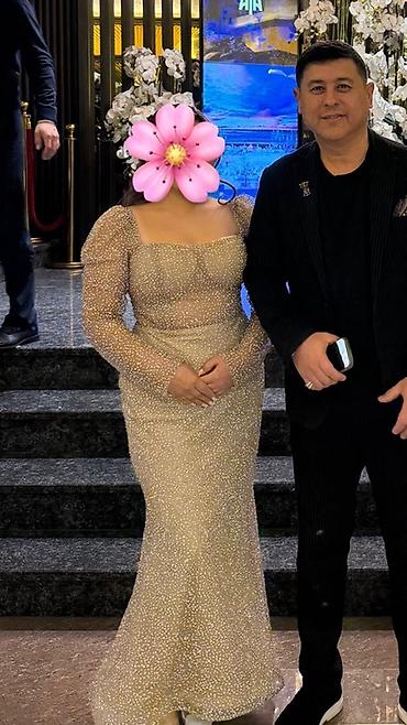 Вечернее платье в пол с длинными рукавами, расшитое россыпью мелких страз.