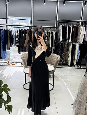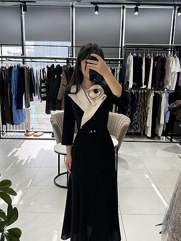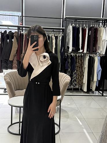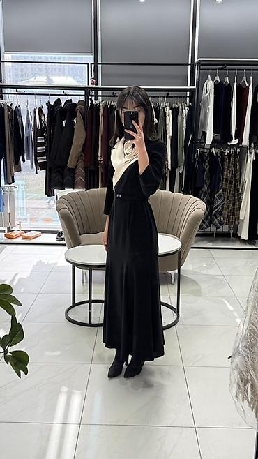 Платье сочетает лаконичность черного цвета и эффектный контраст за счет сатиновой драпировки, создавая утонченный, запоминающийся образ. Подходит к лодочкам и ботильонам, можно добавить минималистичные серьги или браслет.