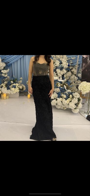 Вечернее платье в пол с блестящим корсетом и фактурной чёрной юбкой