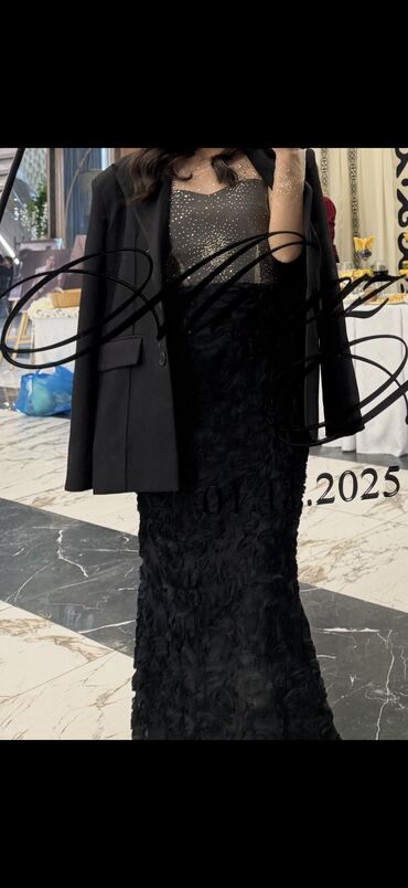 Вечернее платье в пол, черное, силуэт «русалка». - Ткань: плотный стрейч с пайеточным декором по всему полотну; узор из блестящих аппликаций создает эффектный рельеф. - Посадка: облегающее по фигу...
