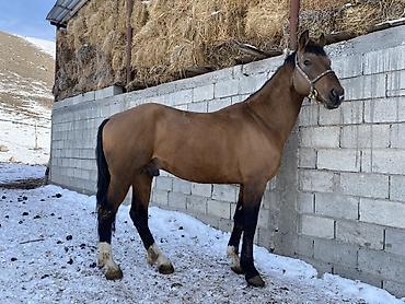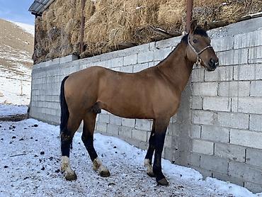Жеребец гнедой масти с темными ногами и густой длинной гривой/хвостом. Крепкая конституция, хорошо развитая мускулатура, ровная спина, глубокая грудь, правильные ноги. Высокий рост, сухая голова, внимательный взгляд. На фото — рабочая сбруя-капсюль.