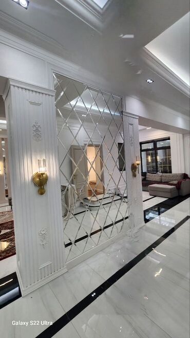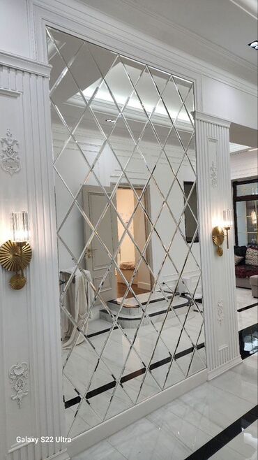 Настенное декоративное панно из зеркал в современном геометрическом стиле. - Комплект: центральное большое панно и две узкие вертикальные панели по бокам. - Дизайн: фасетные зеркальные элементы, с...