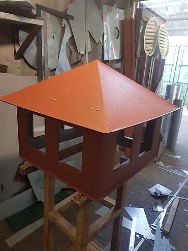 - Флюгарки/дефлекторы/колпаки на дымоходы и вентиляционные шахты: защита от осадков и задувания, усиленный каркас, съемные элементы для обслуживания. Любые сечения (квадрат, прямоугольник, круг), варианты крыш: четырехскатная, конус, «домик».
