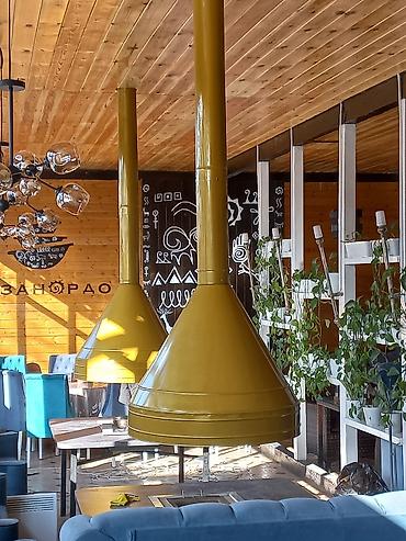 - Декоративные вытяжные зонты для очагов/мангалов в зале: подвесные, круглая или коническая форма, с прямым/телескопическим дымоходом. Эффективный захват дыма, возможность центрирования над столом или очагом. Под покраску в любой RAL, гладкая или текстурная эмаль.