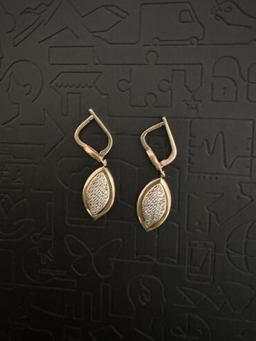 - Дизайн: вытянутые подвески «маркиза» с центральной частью, усыпанной мелкими фианитами (паве), окантовка тёплого золотого тона