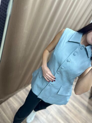 Жилет женский, черный, без воротника - Классический приталенный крой - Застежка на ряд обтянутых пуговиц спереди - Аккуратные вытачки для посадки по фигуре - Материал: 65% хлопок, 35% полиэстер (б...