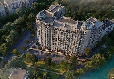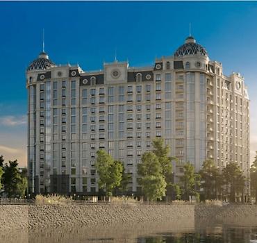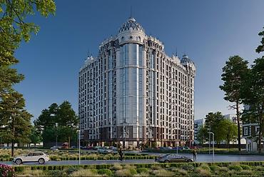 Жилой дом с выразительной архитектурой в стиле модерн/неоклассика. Здание переменной этажности с эффектными угловыми ротондами и панорамным остеклением, фасады с декоративными элементами, эркерами и французскими балконами.