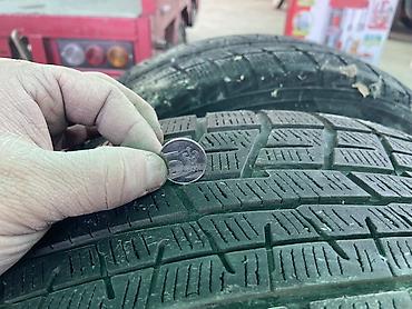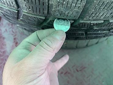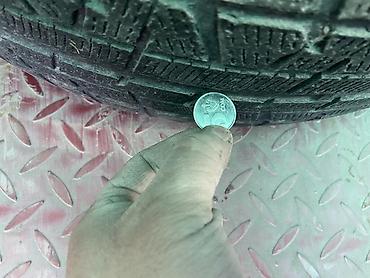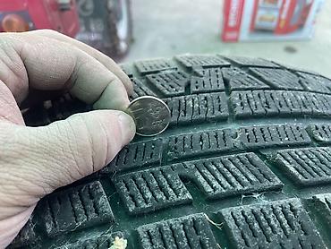 - Глубина протектора: визуально значительная; для наглядности показано измерение монетой.