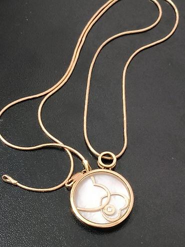 - Кулон: круглой формы с белой перламутровой вставкой; декоративный рисунок из золота в виде пересекающихся линий/сердец. В нижней части — небольшая прозрачная вставка-камень в круглой оправе.