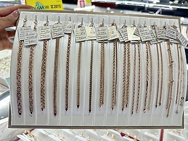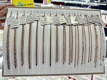 Золотые браслеты, розовое золото - Металл: золото (вид излома и цвет — розовое/красное). На ярлыках указана проба 585. - Ассортимент плетений: панцирь (классика и двойной), фигаро, бисмарк/кардина...