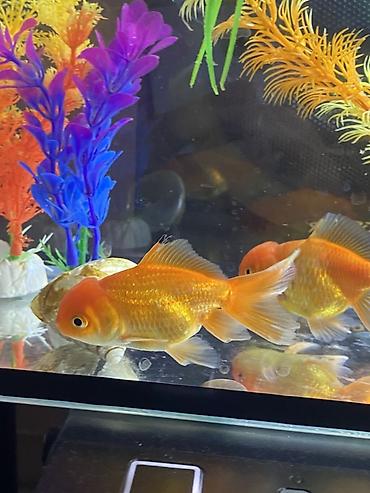 Аквариумные золотые рыбки (фэнтэйл/вуалехвост, возможны окрасы оранжево-золотой и золотисто‑черный).