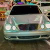 Серебристый седан Mercedes-Benz, модель E-класса (W210), оснащенный четырьмя дверями. Автомобиль имеет характерный дизайн с четырьмя круглыми фарами спереди и легкосплавными дисками. Задние фонари ...