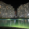 - Двуспальная кровать с мягким большим изголовьем геометрической формы.