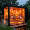 Угловой диван-кровать в темном цвете с деревянными подлокотниками и встроенным столом. Диван имеет модульную конструкцию, что позволяет адаптировать его под различные конфигурации помещения. В разл...
