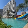 - Современный многоэтажный комплекс с выразительным фасадом: витражные окна в пол, закругленные углы и декоративная...