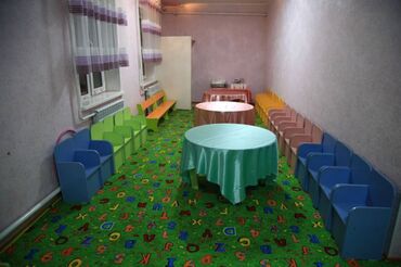 - Посадочные места для детей: рядные низкие кресла‑стульчики из пластика/ЛДСП разных цветов (голубые, зелёные, жёлтые, розовые) по обеим сторонам комнаты.
