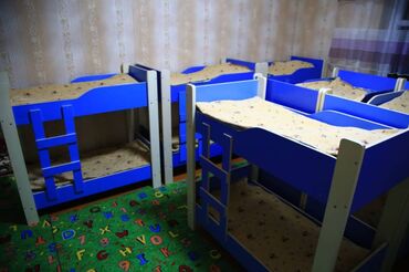 - Спальные места: многоярусные детские кровати модульного типа, с бортиками по периметру, встроенными лестницами и перегородками. Цвет — синий с светлыми стойками. Предусмотрены верхние и нижние места, компактная расстановка «островами» для экономии пространства.