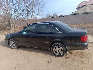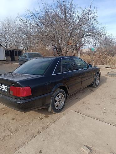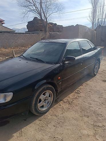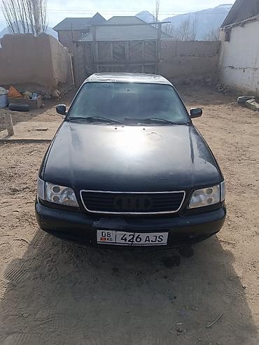 Audi 100 C4 седан, черный цвет. Бензиновый двигатель 2.8 (эмблема “2.8” на крышке багажника), передний привод. Кузов 4-дверный, тонированные стекла. Литые диски, брызговики, центральная антенна на крыше. Оптика с прозрачными рассеивателями, черная решетка радиатора с фирменными кольцами. Задние фонари красные полноформатные. Номерной знак KG на бампере.