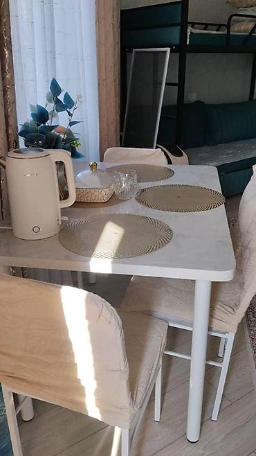 - Обеденная зона: стол на 4 персоны, стулья с чехлами, сервировка.