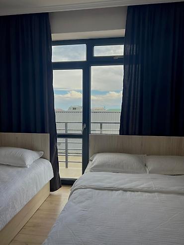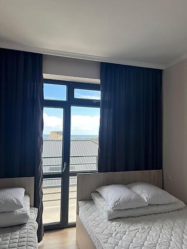 - Номера с 2 отдельными кроватями или двуспальной и односпальной кроватью; светлые, с большими окнами/выходом на балкон, плотными шторами, свежим постельным бельём и подушками. Из ряда номеров вид на море и крыши курортного посёлка.