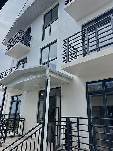 - Современное 3-этажное здание с панорамными окнами и балконами.
