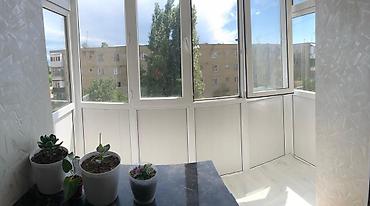 - Уютная застекленная лоджия с панорамным остеклением и подоконной столешницей.