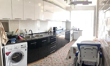 - Большая кухня в едином стиле: глянцевый гарнитур (верх – белый, низ – черный), длинная рабочая столешница, две мойки, варочная зона, духовой шкаф, вытяжка, место под крупную технику, стиральная машина LG. Напротив – обеденная зона.