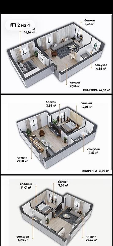 - Площади квартир: примерно 42,4 м², 49,53 м², 51,98 м² (варианты на выбор).