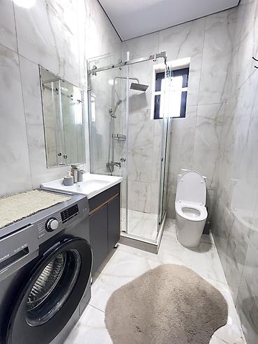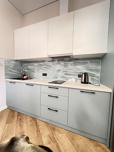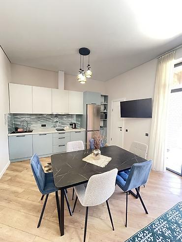 - Кухня-гостиная: гарнитур с верхними белыми и нижними серыми фасадами, фартук с мраморной текстурой, варочная панель, вытяжка, холодильник, мойка с черным смесителем, электрический чайник, обеденный стол из черного камня/керамогранита на металлических опорах, 4 мягких стула, подвесной светильник, настенный телевизор.