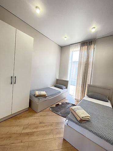 - Спальня 2: две односпальные кровати, высокий платяной шкаф, окно в пол с тюлем.
