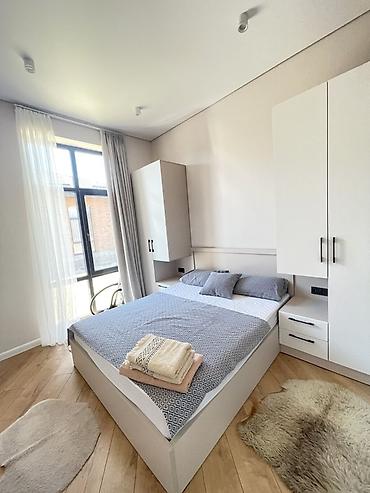 - Спальня 1: двуспальная кровать, прикроватные тумбы, встроенные шкафы, панорамное окно с лёгкими шторами.
