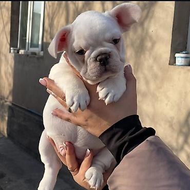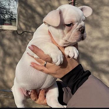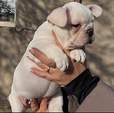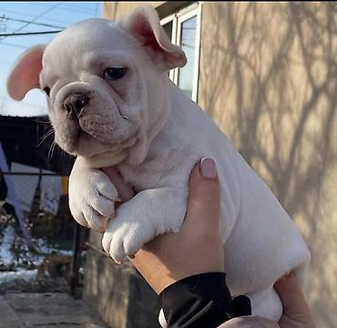 Щенок породы бульдог (типичный компактный формат): плотный корпус, широкая грудь, короткие лапы, мощная голова с выраженными складками. Окрас однотонный белый. Короткая гладкая шерсть, удобная в уходе. Нос короткий, уши полустоячие, хвост короткий.