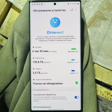- ПО: Android с фирменным интерфейсом One UI; раздел «Обслуживание устройства» показывает «Отлично», угрозы не обнаружены.