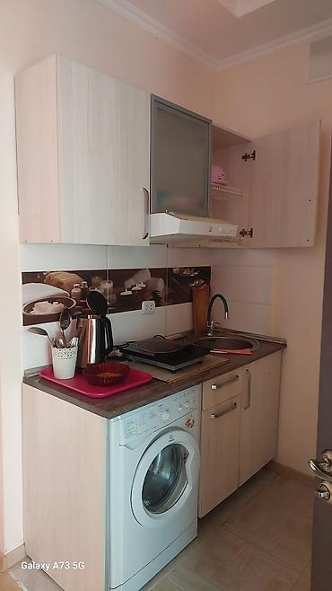 - Мини-кухня: столешница, круглая мойка, верхние и нижние шкафы, вытяжка, настольная двухконфорочная электрическая плита, электрический чайник, комплект столовых приборов и посуды на подставке.
