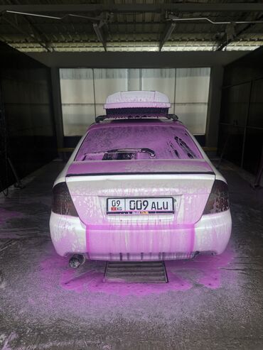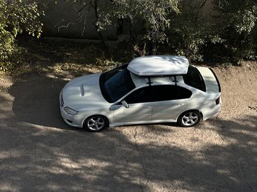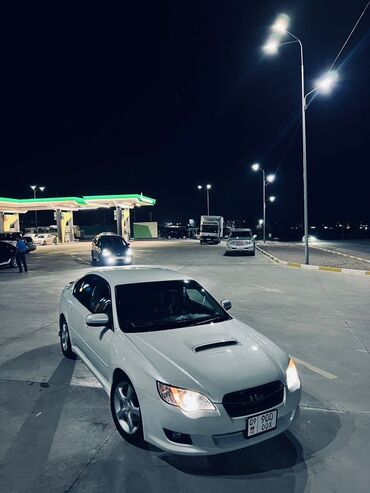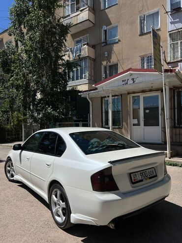 Subaru Legacy (седан), белый цвет, правый руль. Кузов BL с фирменным воздухозаборником на капоте и аэродинамическим обвесом. Светотехника: линзованные фары, противотуманные фары, тонированные задние фонари. Колеса: легкосплавные диски Subaru, низкопрофильные шины. Экстерьер: задний спойлер, массивный выхлоп, хромированная окантовка решетки радиатора, боковые пороги.