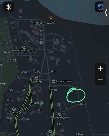 Земельный участок на карте (обведён зелёным) в курортной зоне рядом с береговой линией. В окружении — гостевые дома и туристическая инфраструктура (Family House, GreenWay Tourist и др.), подъезд по внутренним улицам посёлка.