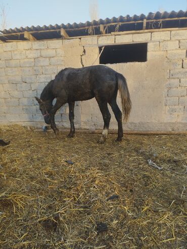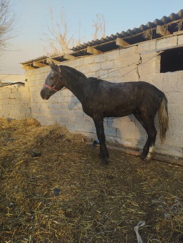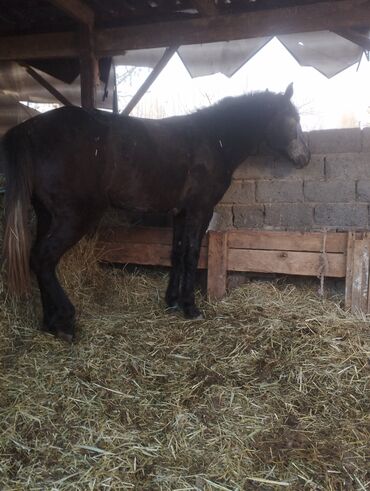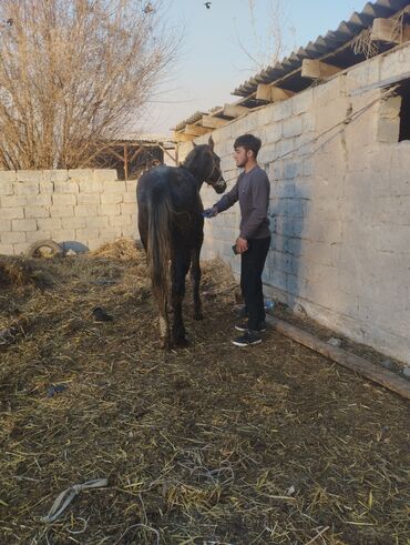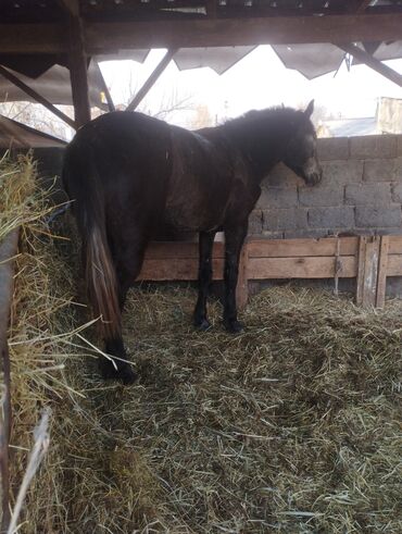 Продаётся лошадь (масть темно-гнедая/вороная с проседью). На фото — высокий, сухой тип, крепкий костяк, длинные ноги, выразительная голова, правильная постановка конечностей. Хвост и грива густые, копыта мощные. Используется недоуздок с повседневной шлеёй.