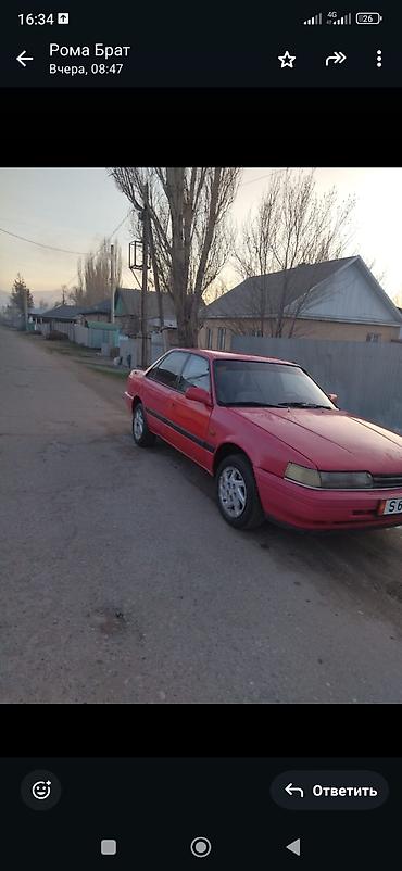 Mazda 626, седан, красный цвет, на киргизских номерах S 6924 V. Кузов поколения конца 80-х – начала 90-х, классический дизайн.