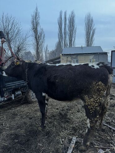 Коровa молочного направления. Особенности: - Масть: черная с белыми отметинами на ногах и брюхе. - Рога, бирки на ушах (идентификационный номер виден на фото). - Подвязь/недоуздок для выгула и фик...