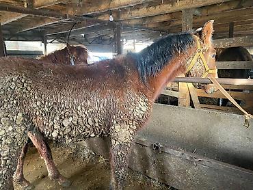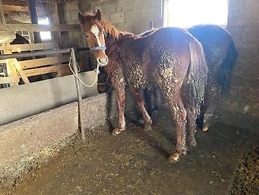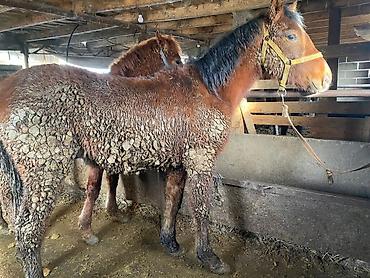 - На фотографиях видны нашлепы засохшей грязи на шерсти после стойлового содержания — необходима тщательная помывка и расчесывание.