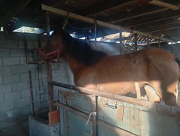 Лошадь гнедой масти. - Полукровный тип, компактное телосложение, крепкие конечности. - Возраст ориентировочно молодой/средний (по фото – полноценный рабочий рост). - Рост примерно 150–160 см в хол...