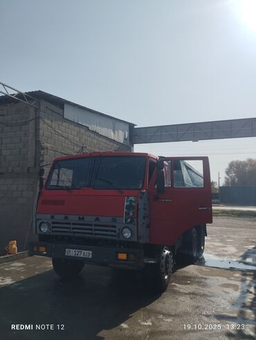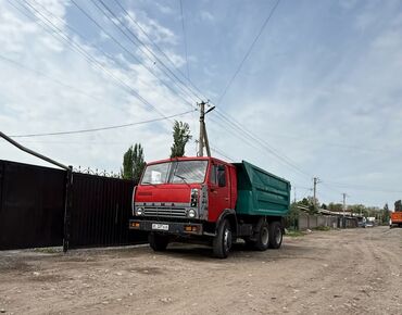 - Трёхосный самосвальный грузовик КАМАЗ с металлическим кузовом зелёного цвета.