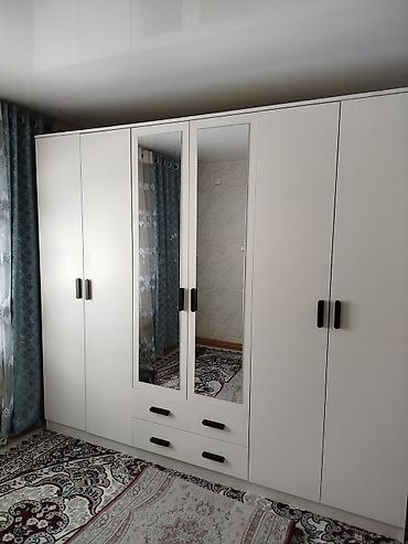 - Вместительный шкаф-купе распашной секционный: пять створок, по центру — две зеркальные двери во весь рост; внизу четыре выдвижных ящика. Ручки контрастные черные.