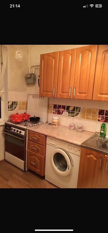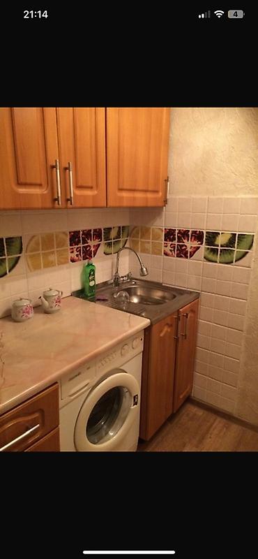 - Кухня: гарнитур с верхними и нижними шкафами, рабочая столешница, мойка, газовая плита с духовкой, вытяжная вентиляция, холодильник, стиральная машина. Фартук из плитки с декоративными вставками. Окно с тюлем, радиатор, линолеумное напольное покрытие.