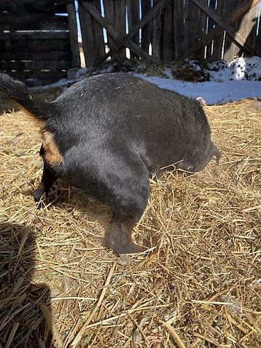 Щенок крупной породы, черно-подпалого окраса. Особенности: - Возраст: щенок (молодой). - Окрас: черный с яркими подпалинами на морде, груди, лапах и бровях. - Телосложение: крепкое, мощные лапы, п...